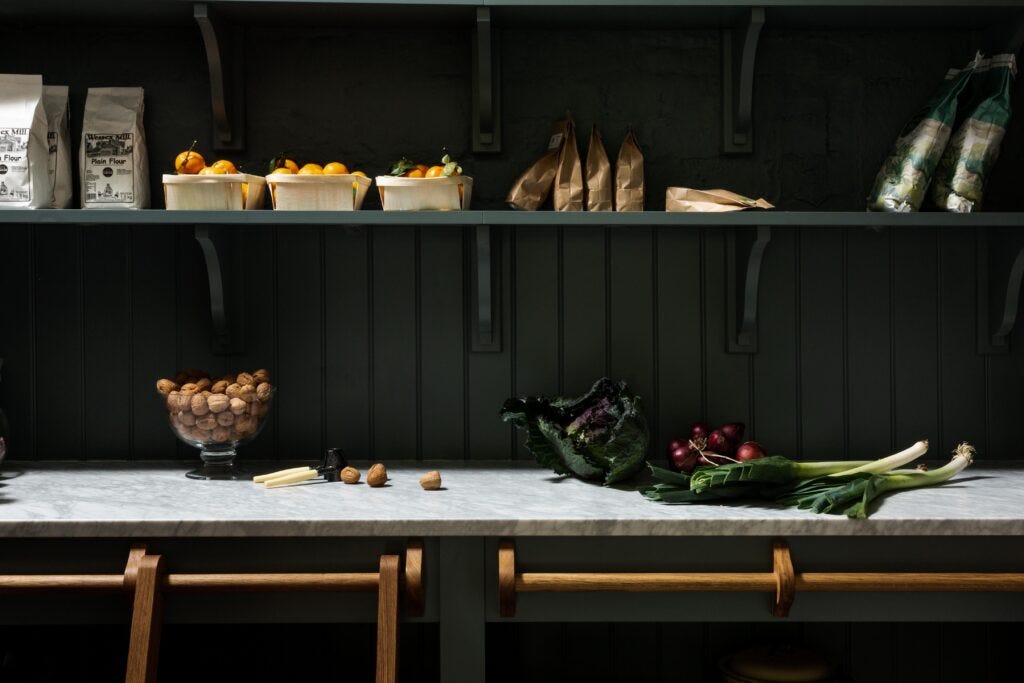 There’s a deliberate contrast here. The first kitchen is for guests to gather in, wine glass in hand, whereas the actual cooking happens in the second kitchen…along with several cutting boards, dirty pots, and scraps of food. The central kitchen has a bowl of artfully arranged lemons; the back kitchen has two industrial-grade ovens with a dash of rustic, weathered wood.